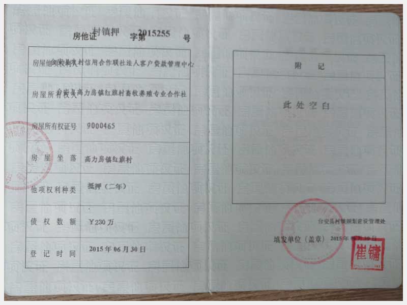名稱:臺安縣高力房鎮(zhèn)紅旗村畜牧養(yǎng)殖專業(yè)合作社 面積:房產(chǎn):10559.98㎡、土地:19807.47㎡ 瀏覽次數(shù):1391